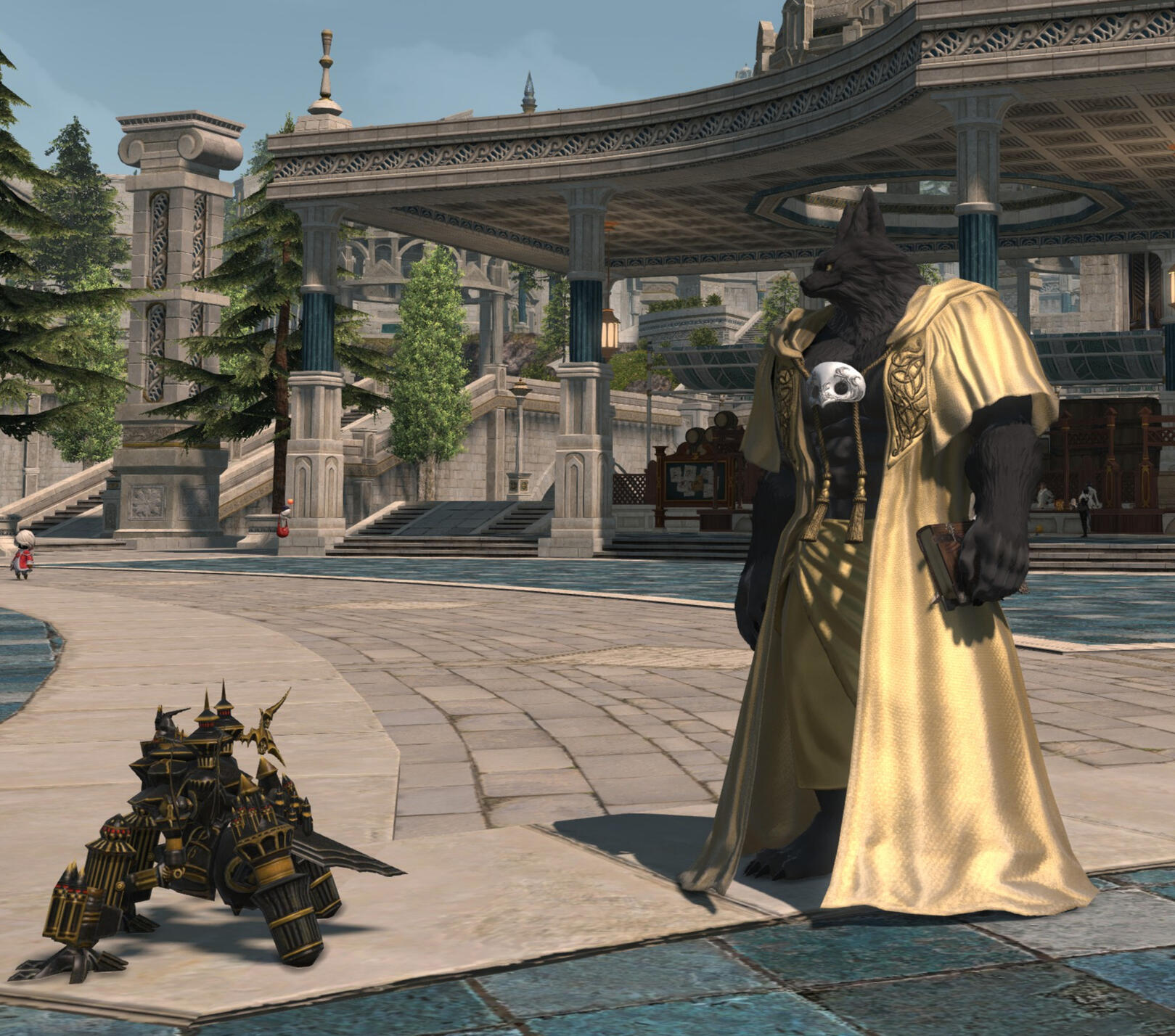 While not wholly strangers to the practice of fighting, this was a battle unlike any they'd encountered and most of the expedition was killed. The crashing ships, flaming hulks raining from the skies and nightmarish beasts devastating anyone in their path before being slain by magitek constructs completely alien to him awakened the Echo in Vuk and inspired a terror she thought she'd never know in Mairola... Seeing the empire slaughter such a horde of dragons shook her to the core, considering they would have won except for the actions of Midgardsormr - and he had died to stop them, while Ishgard struggled to fend off a single one of the wyrmking's sons from devastating a village. But even as she realized this, her training compelled her to rush in to find and help survivors.She was the one who found Vuk, sheltered beneath his parents' bodies, the traumatized pup unable to speak or protest as she carried him to safety and saw to his injuries. Not knowing what his name was and with both him unable to tell her and, as far as she was aware, no one left to care for him, she took him in and took to calling him Vuk as they made their way back to Ishgard, as she wasn't sure where else to go. Getting him past the gate guards was easy by comparison: she simply explained his parents had been killed in combat with dragons, so the pup couldn't be a heretic and they let her through. However, just because he was allowed into the city did not mean he was accepted. Between that and no longer having the confidence in Ishgard's course she'd once had, it proved easy for Mairola to abandon her former home - getting permission from her superior officers in the Inquisition to conduct a survey of Tailfeather... To make sure their supply of war chocobos was secure against any heretic infiltration, of course.So far from the city she raised Vuk to be largely self-sufficient as was necessary on the Dravanian frontier... until Clementaux found her, the Sharlayan scholar having retired from the Forum to handle the search for two of their nation's most unusual scholars - and his friends. For Vuk's sake, the two did not come to blows, and eventually came to an arrangement: Clementaux would take Vuk to Sharlayan for half the year to focus on his mental growth, while Mairola trained his body and survival abilities during the other half of the year, though as the young lupin grew into adolescence and Clementaux and Mairola grew into something approaching friends, Vuk spent more and more time in Sharlayan - much to his dismay, as Celementaux had an entirely unironic love of archon loaf. Upon graduation, Clementaux and Mairola began taking Vuk on trips to explore the wider world and it was during one such trip into the ruins of Sharlayan three years ago that they came across a group of au ra who seemed to be in the middle of some kind of ritual...Exactly what happened is known only to a few people, but after that Vuk became more and more interested in the rest of the world, waiting until both of his caretakers had passed before he left Dravania and Coerthas for Eorzea. Some speculate that the toy Alexander seen constantly in his company could be a hint as to what happened, but whether Vuk confirms, denies or remains quiet on the subject depends entirely on his current mood.In terms of his personality... Vuk seems to be a fairly altruistic, straight-forward and patient individual, always willing to help out others and is fairly optimistic in his outlook. Perhaps at odds with this, he’s also something of a mischievous individual and seems to - on occasion - lose his train of thought mid-sentence or even make non-sequitur commentary. When this happens, he usually tends more toward referring to himself in the third person, almost in a way that implies there's more than one of him.